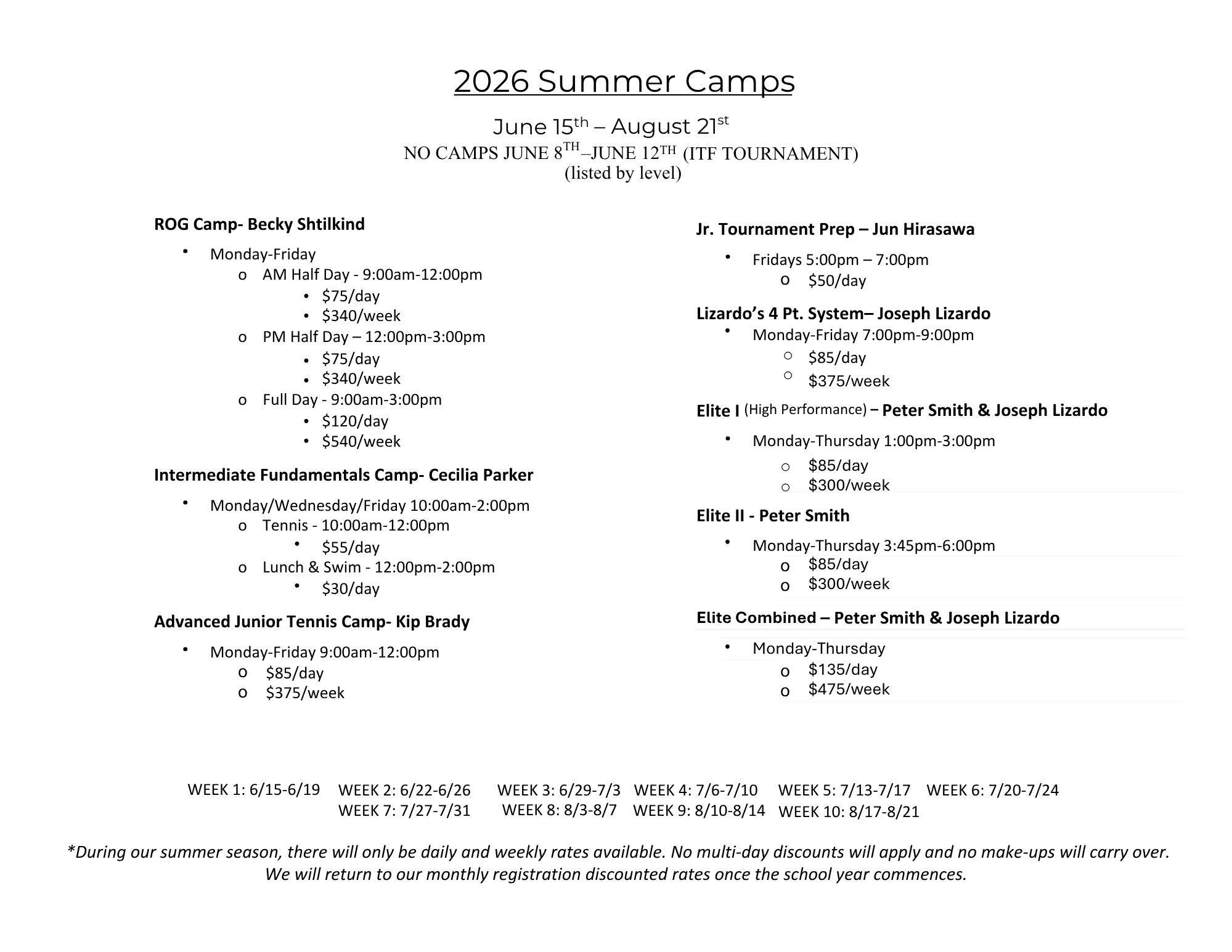 Summer Camp 2026 runs from June 8th to August 21st. Please see the tabs below for individual summer camp classes and schedules. Email info@jackkramerclub.com with any questions regarding Summer Camps.